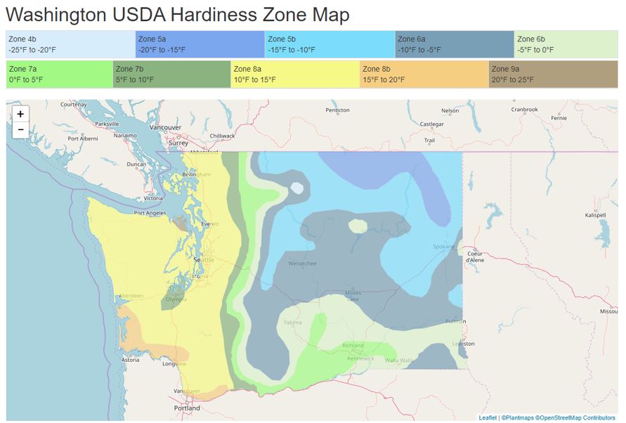 The majority of Grays Harbor and Pacific Counties, Washington, fall into USDA Plant Hardiness Zones 8a and 8b, which have an average annual minimum temperature range of 10 to 15 F and 15 to 20 F, respectively.