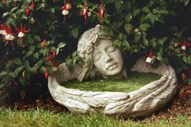 Fill with any planting material that thrives in water or a marshy soil, such as azola (fairy fern), variegated four-leaf water clover, water lettuce. The simple water feature shown here contains Azola, which is a small leaved aquatic plant that thrives in morning sun.